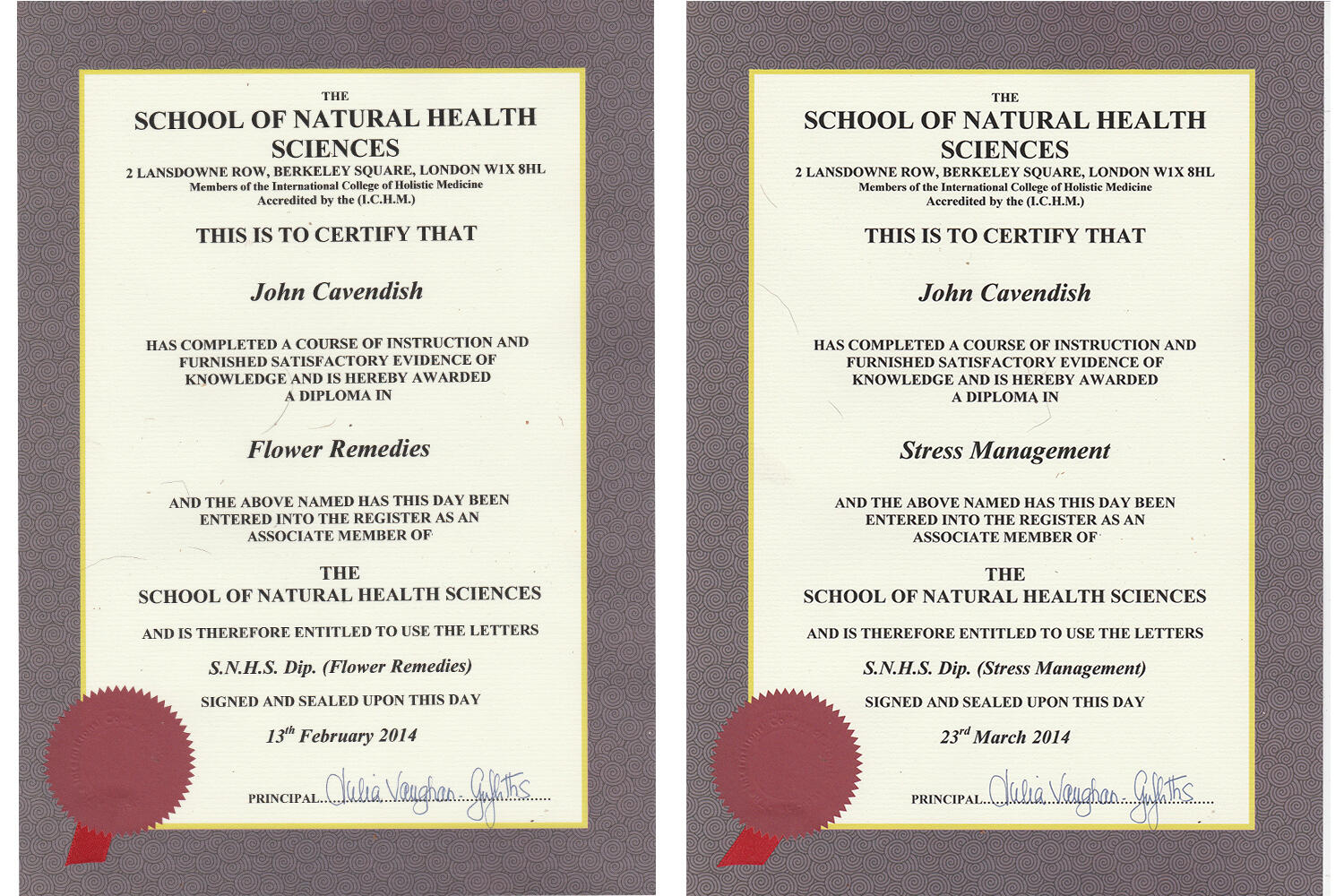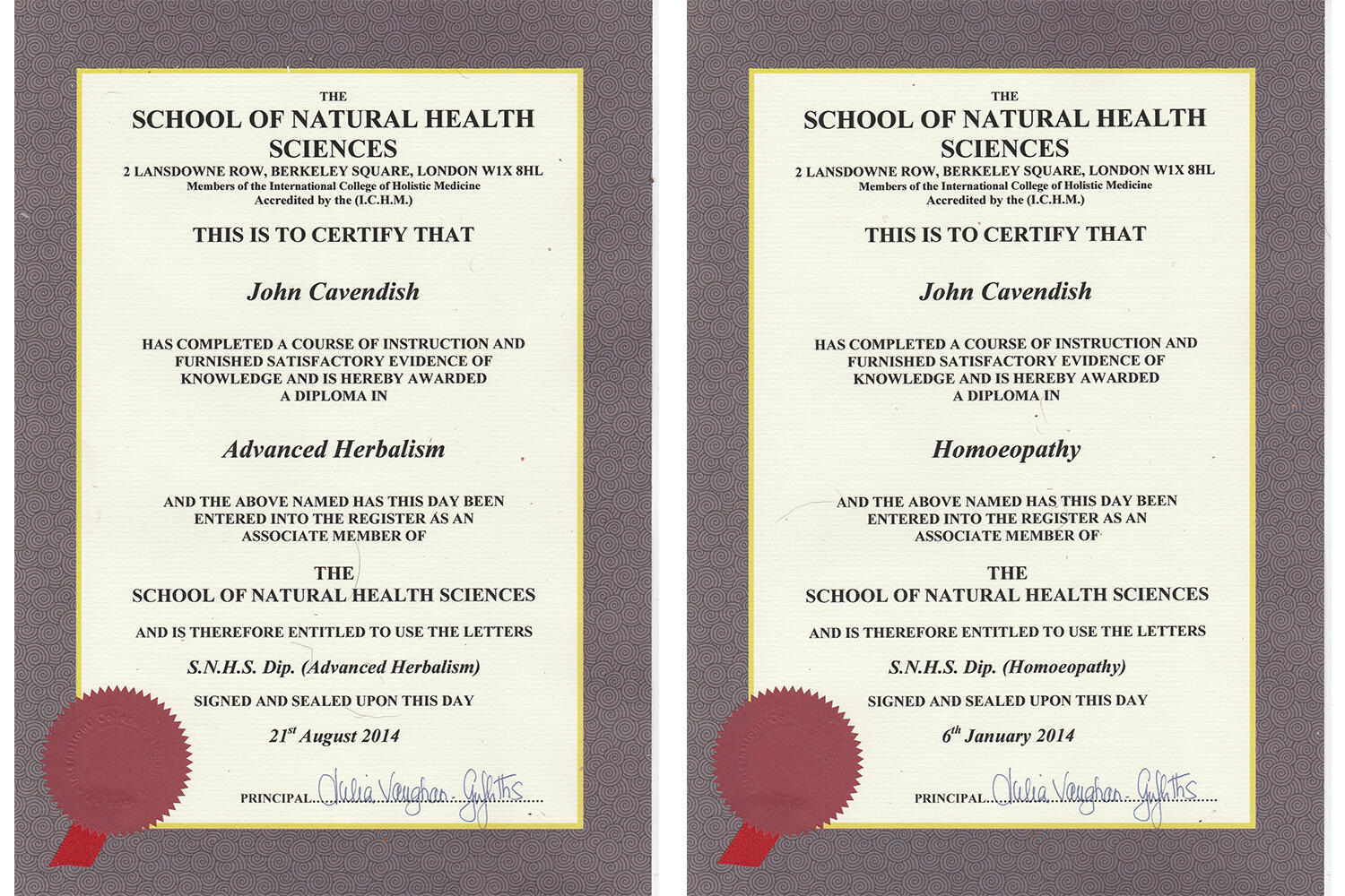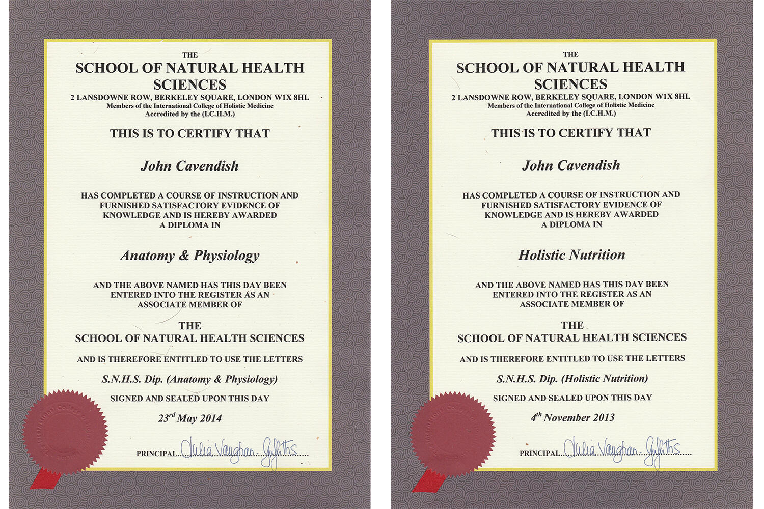 I studied for three years with the School of Natural Health Sciences and hold 11 distinction level Diplomas: