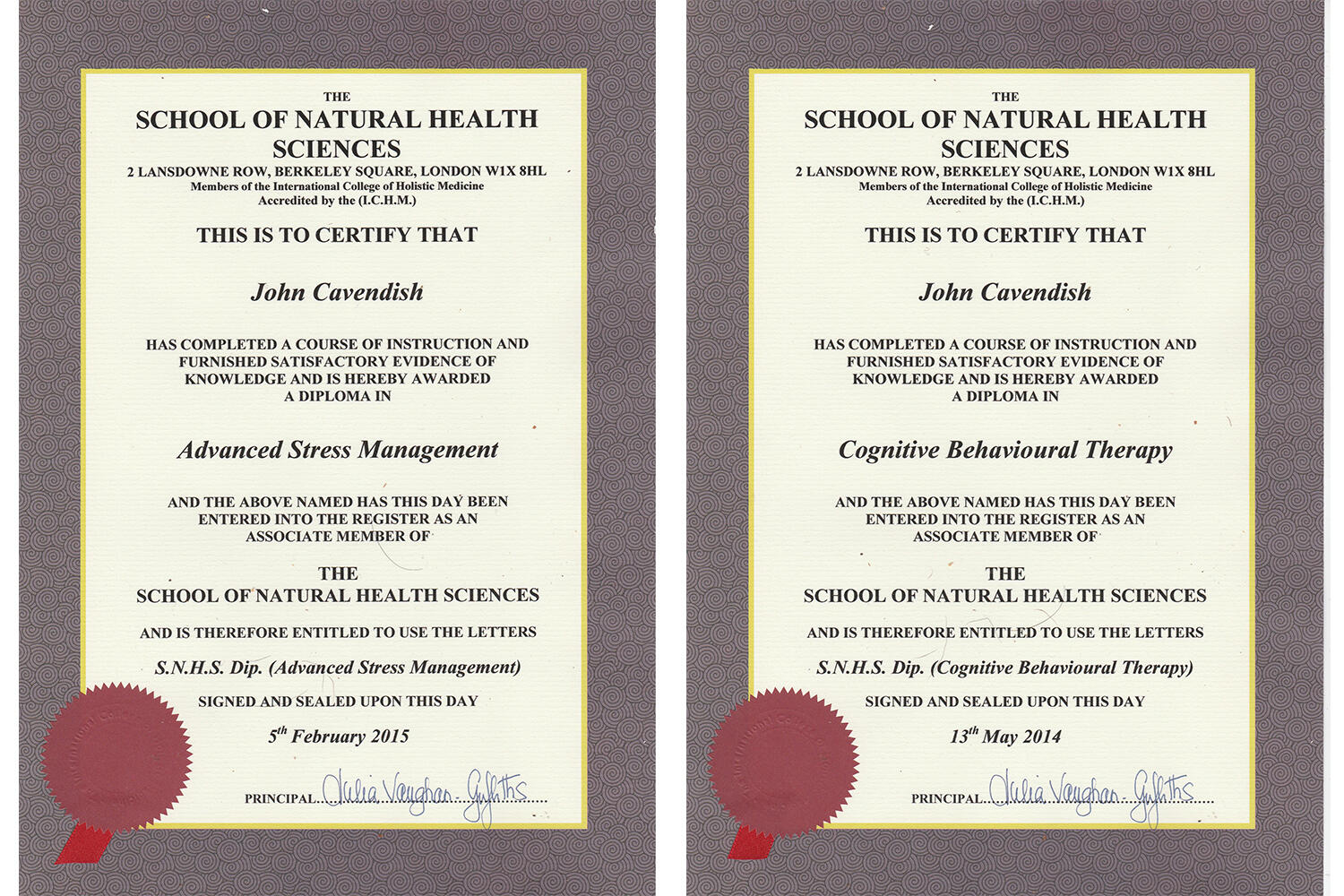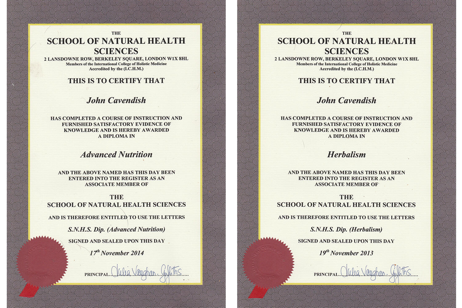 I studied for three years with the School of Natural Health Sciences and hold 11 distinction level Diplomas: